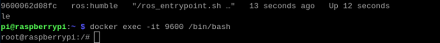 1) 输入“docker exec -it -u ubuntu -w /home/ubuntu 9600 /bin/bash”指令,进入容器。(注意:9600 是装有ROS2 环境的容器ID)