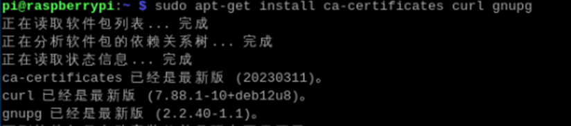 2) 输入指令“sudo apt-get install ca-certificates curl gnupg”安装所需的证书、工具和GPG(GnuPG)密钥管理工具。