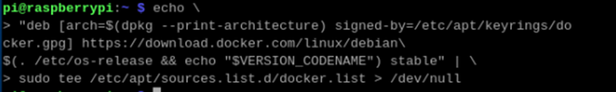 echo "deb [arch=armhf signed-by=/usr/share/keyrings/docker-archive-keyring.gpg] https://download.docker.com/linux/raspbian $(lsb_release -cs) stable" | sudo tee /etc/apt/sources.list.d/docker.list > /dev/null
